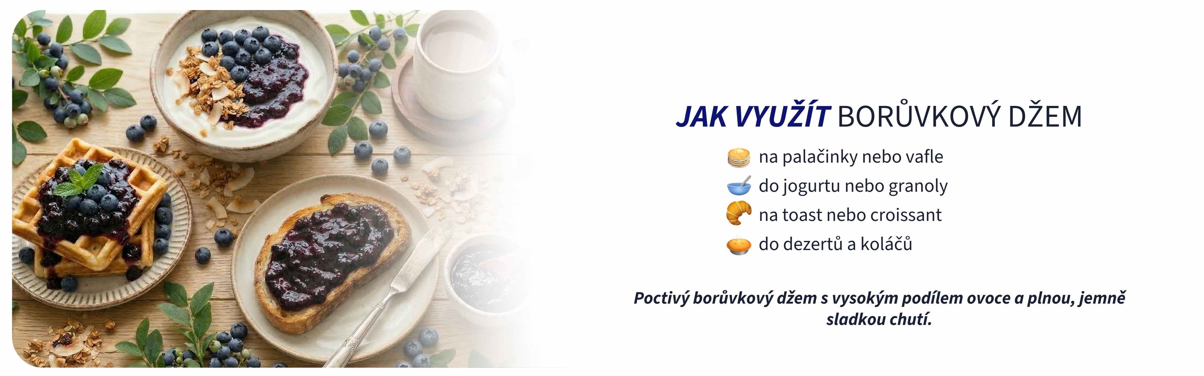 Poctivý borůvkový džem s vysokým podílem ovoce a plnou, jemně sladkou chutí. Přirozená chuť lesních borůvek bez zbytečných přísad.