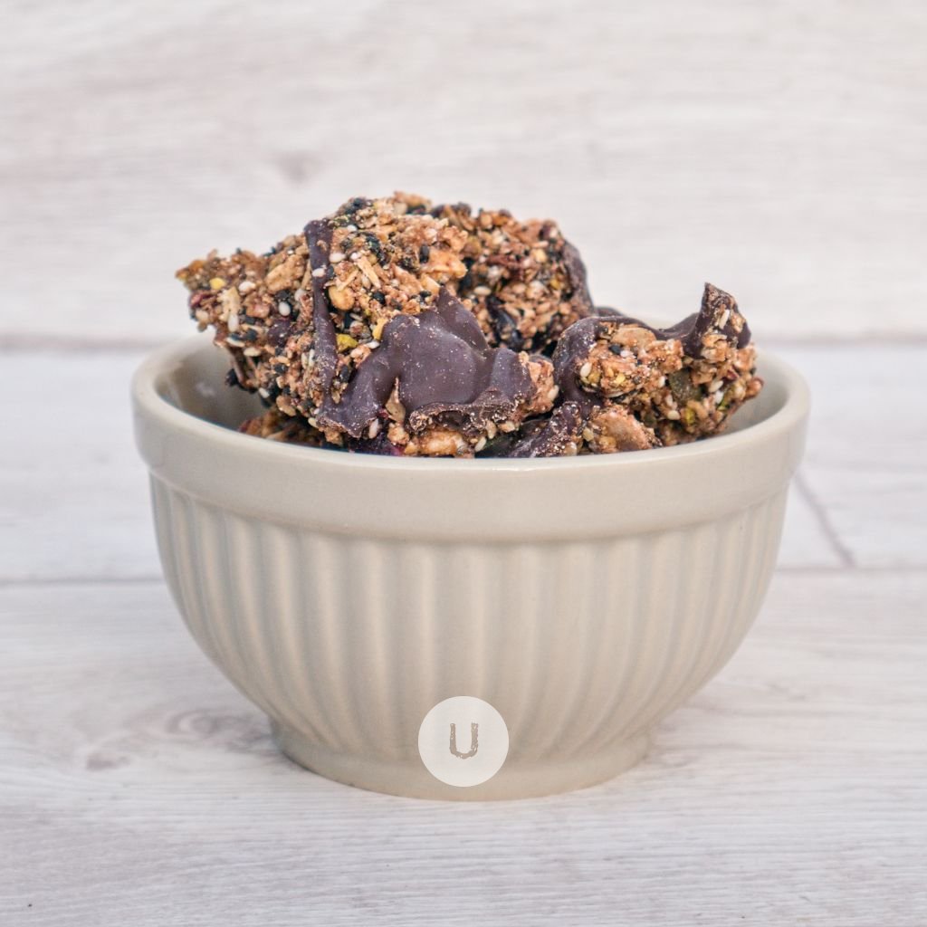 Granola Kakao čoko je ručně vyráběná pečená směs z kvalitních surovin, které tvoří vyváženou a přirozeně chutnou snídani. Základ tvoří vločky, ořechy, semínka a sušené ovoce, doplněné kakaem, čokoládou a kakaovými boby pro plnou, jemně čokoládovou chuť. Vše je spojeno karamelizovaným ječným sladem, bez použití rafinovaného cukru.