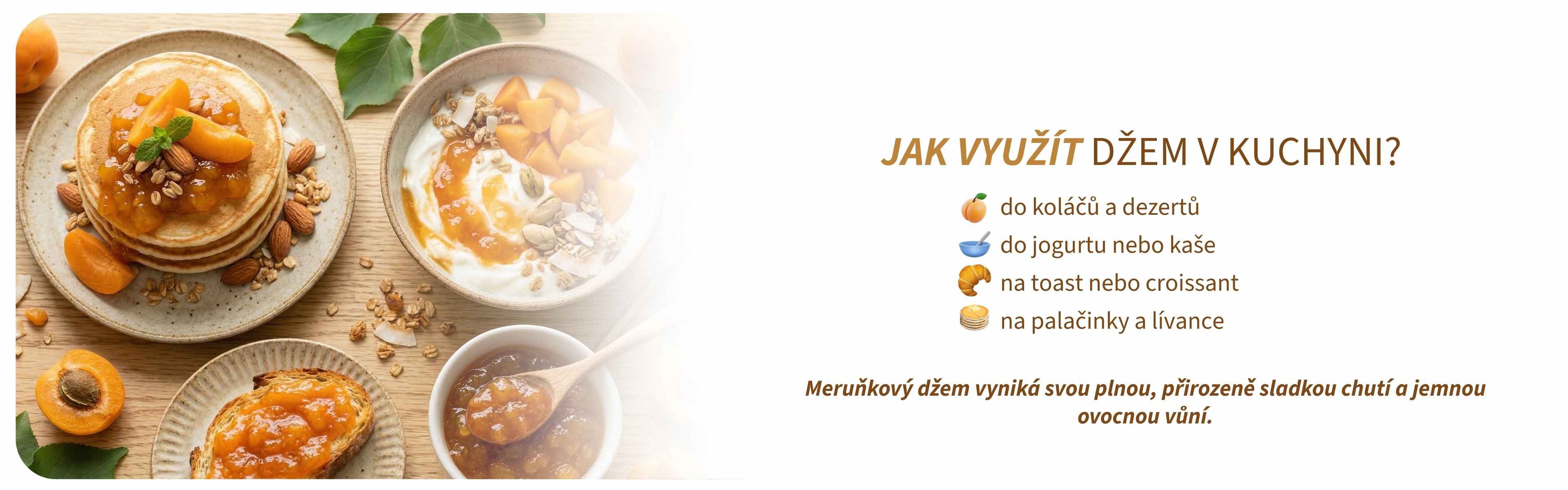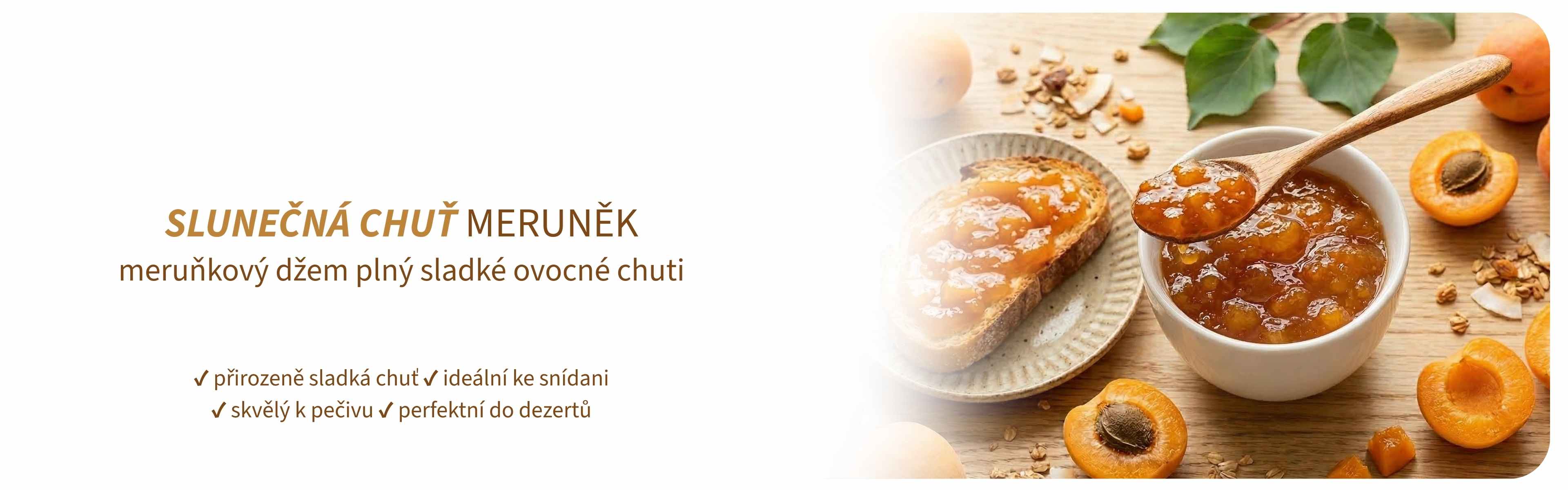 Poctivý meruňkový džem s vysokým podílem ovoce a plnou, přirozeně sladkou chutí. Jemný, voňavý a bez zbytečných přísad.