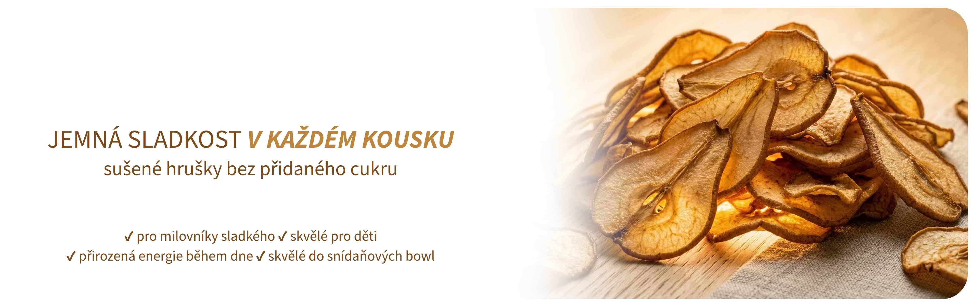 Přirozeně sladké sušené hrušky bez přidaného cukru a konzervantů. Jemná chuť, vůně zralého ovoce a čistá příroda v každém plátku.