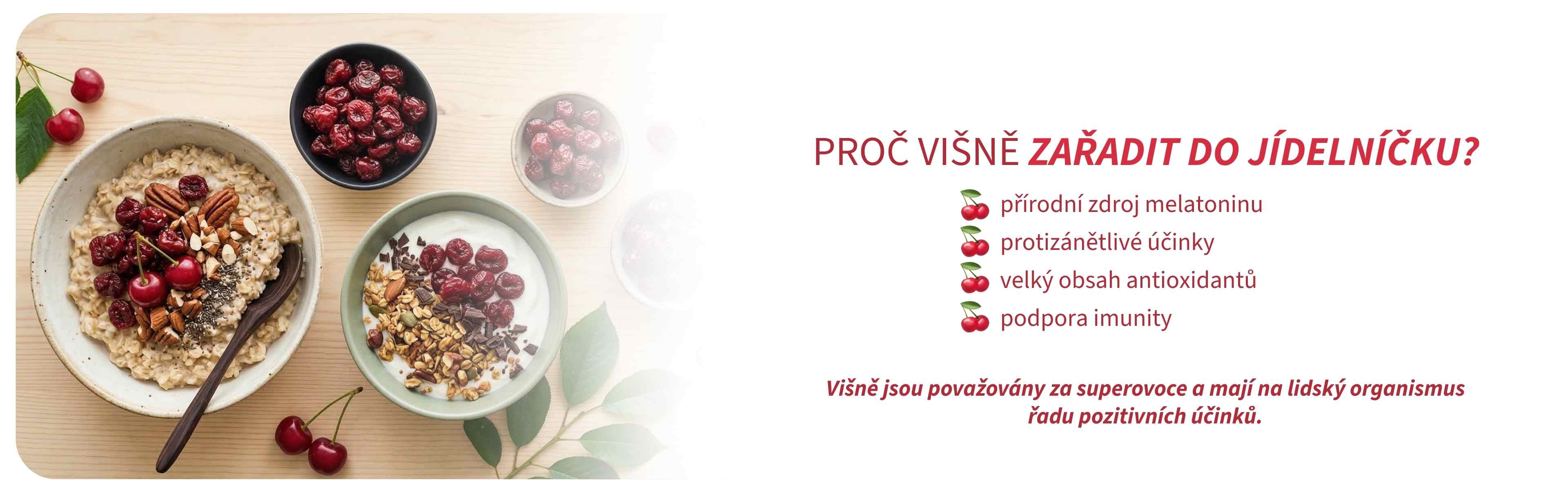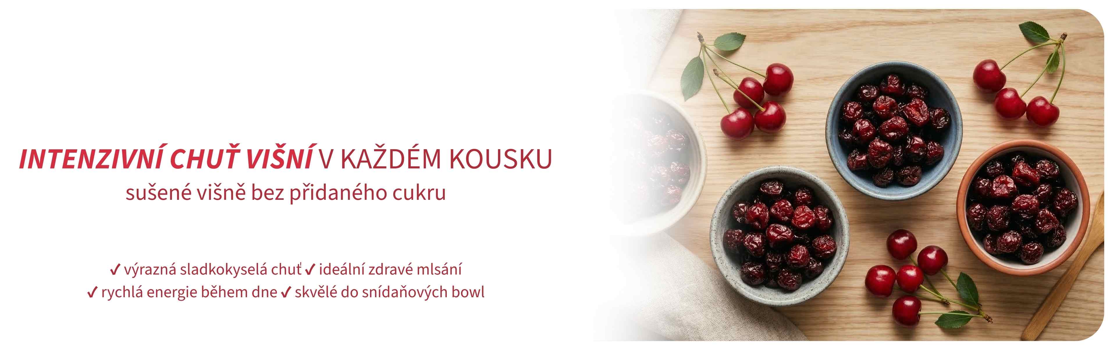 Sušené višně s plnou, přirozeně nakyslou chutí. Bez přidaného cukru a bez chemie. Intenzivní ovocná chuť v čisté podobě.