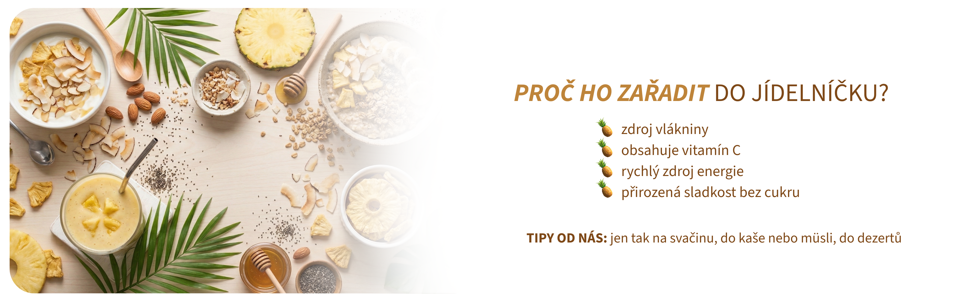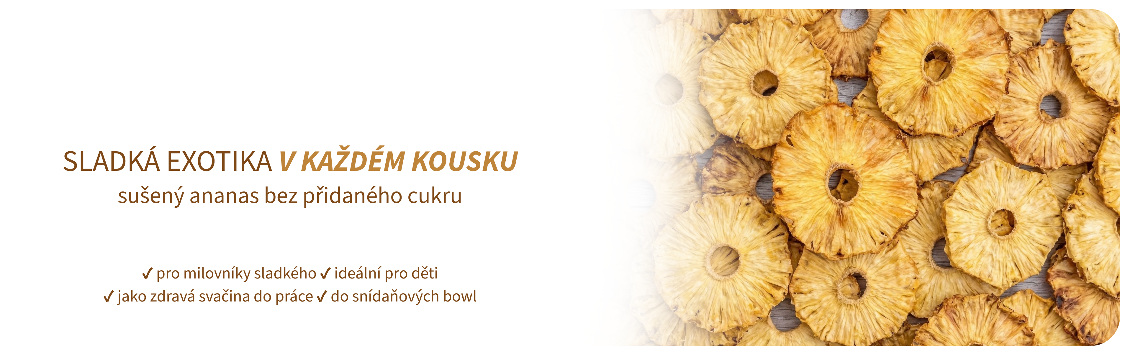 Přirozeně sladkokyselý sušený ananas s plnou chutí a intenzivní vůní. Bez přidaného cukru a bez chemie. Exotika v čisté podobě.