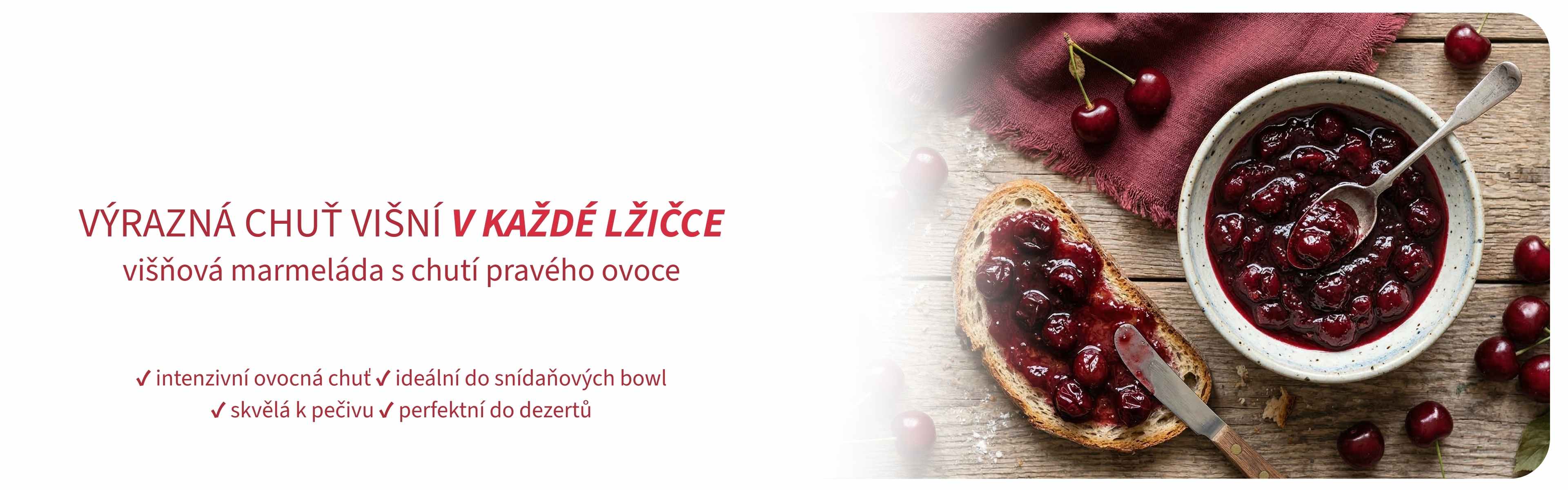 Poctivá višňová marmeláda s plnou ovocnou chutí a jemnou kyselinkou. Vysoký podíl ovoce, bez zbytečných přísad. Skvělá na pečivo i do dezertů.
