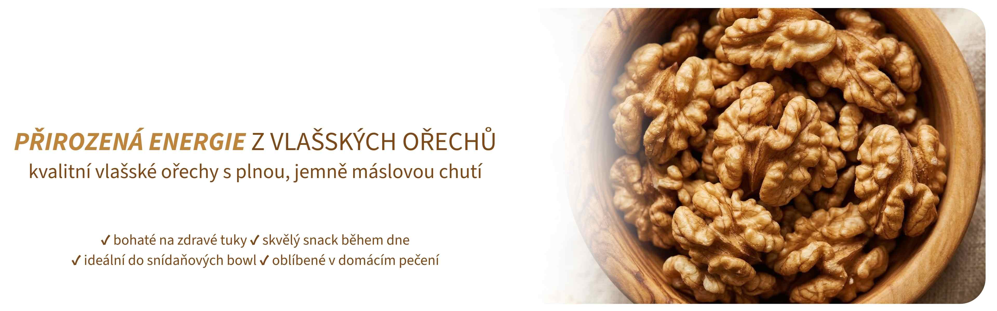 Kvalitní vlašské ořechy s plnou, jemně máslovou chutí. Přirozený zdroj energie, zdravých tuků a živin. Ideální na pečení, do snídaně i jako svačina.